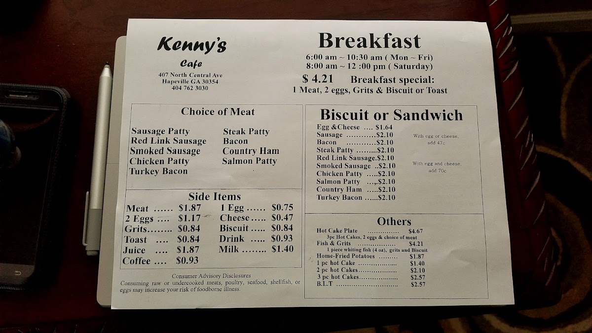 Introducing Kenny's Cafe, a hidden gem located at 407 N Central Ave in Hapeville, Georgia. This cozy eatery offers an enticing menu that combines hearty soul food with quality ingredients at unbeatable prices. Start your day with their Breakfast Special, featuring 1 meat, 2 eggs, grits, and either a biscuit or toast, all for just $9.00. For lunch, indulge in their generous plates, like the 1 meat and 2 veggies option, perfect for satisfying appetites.